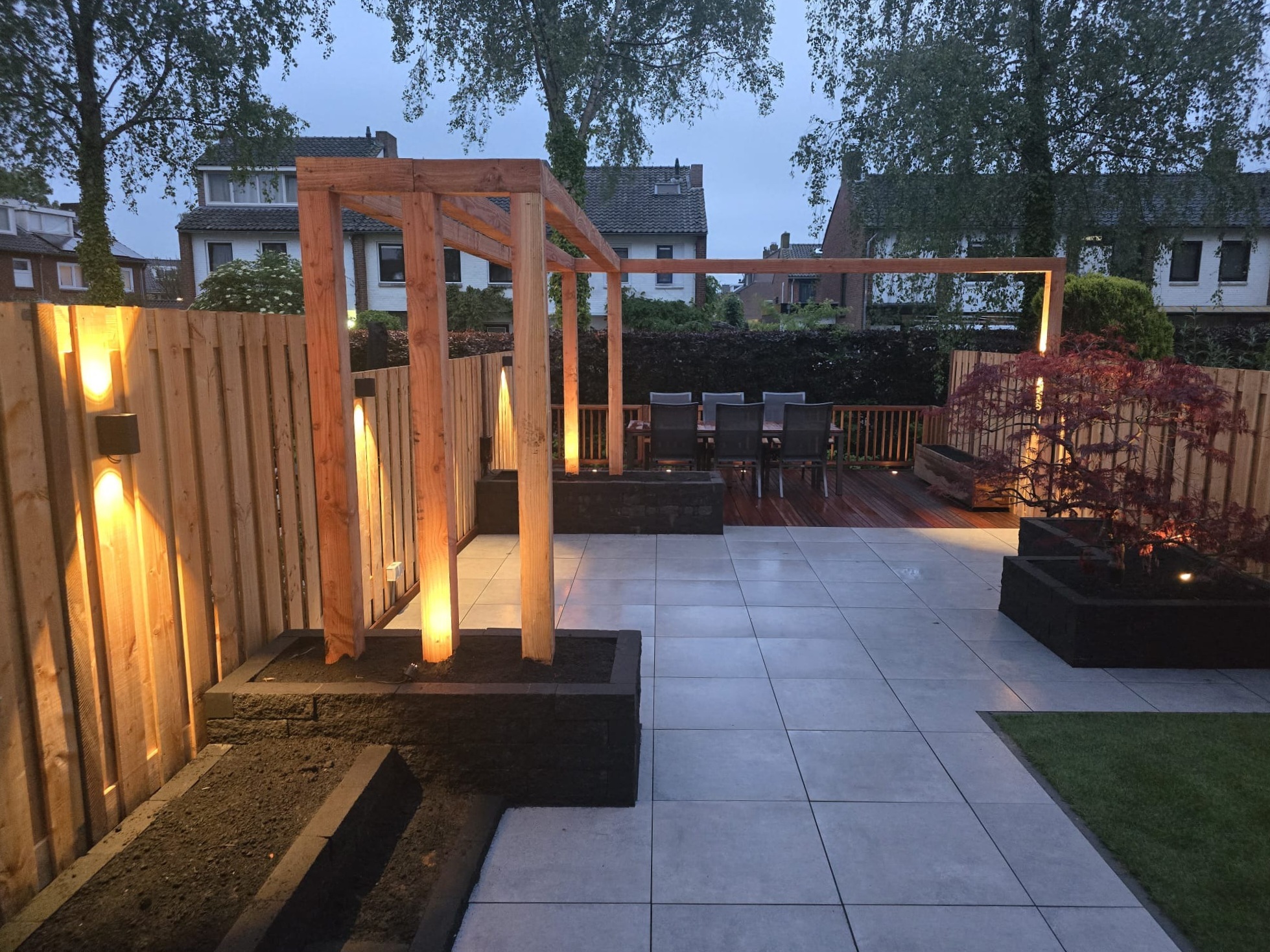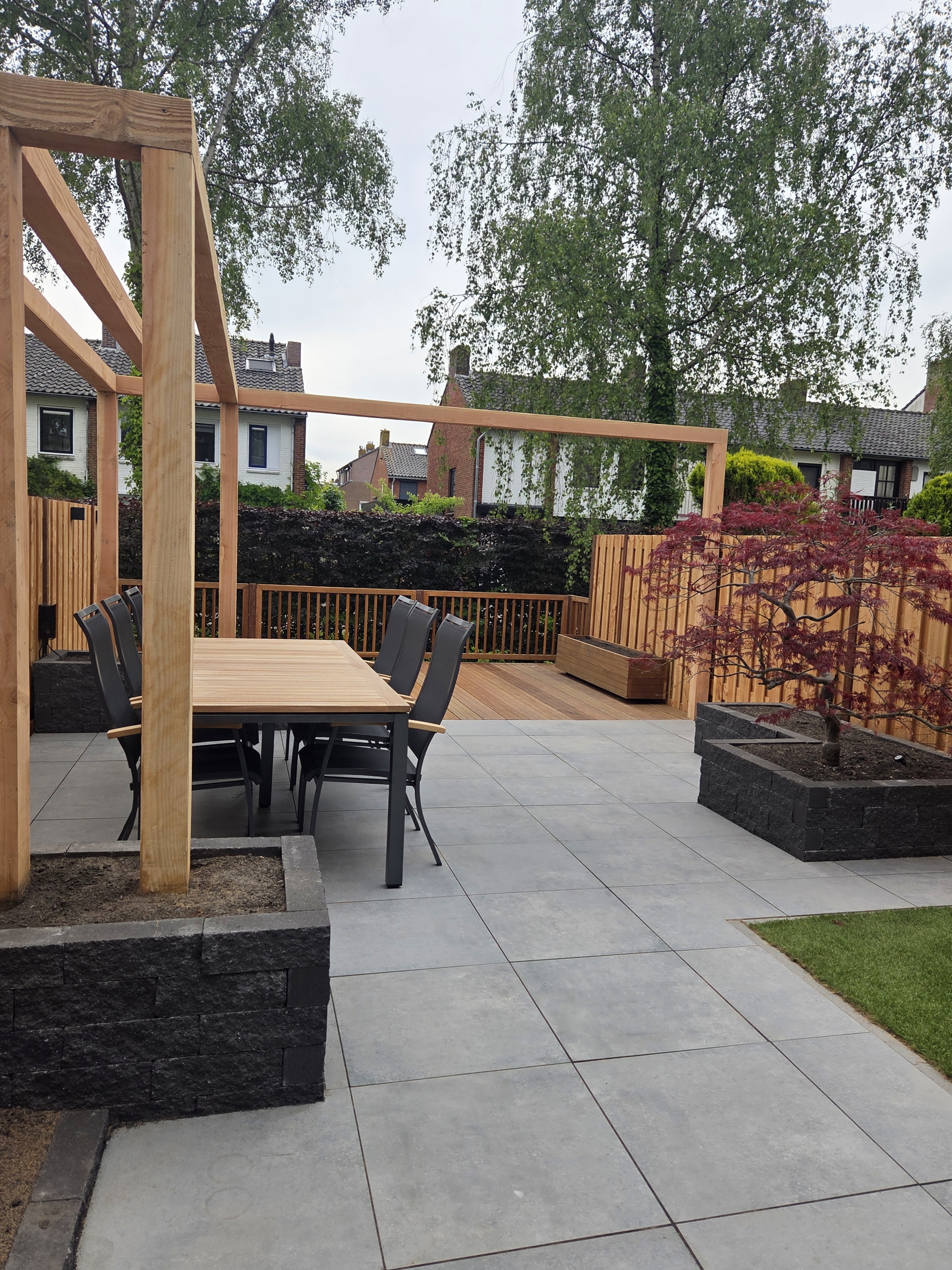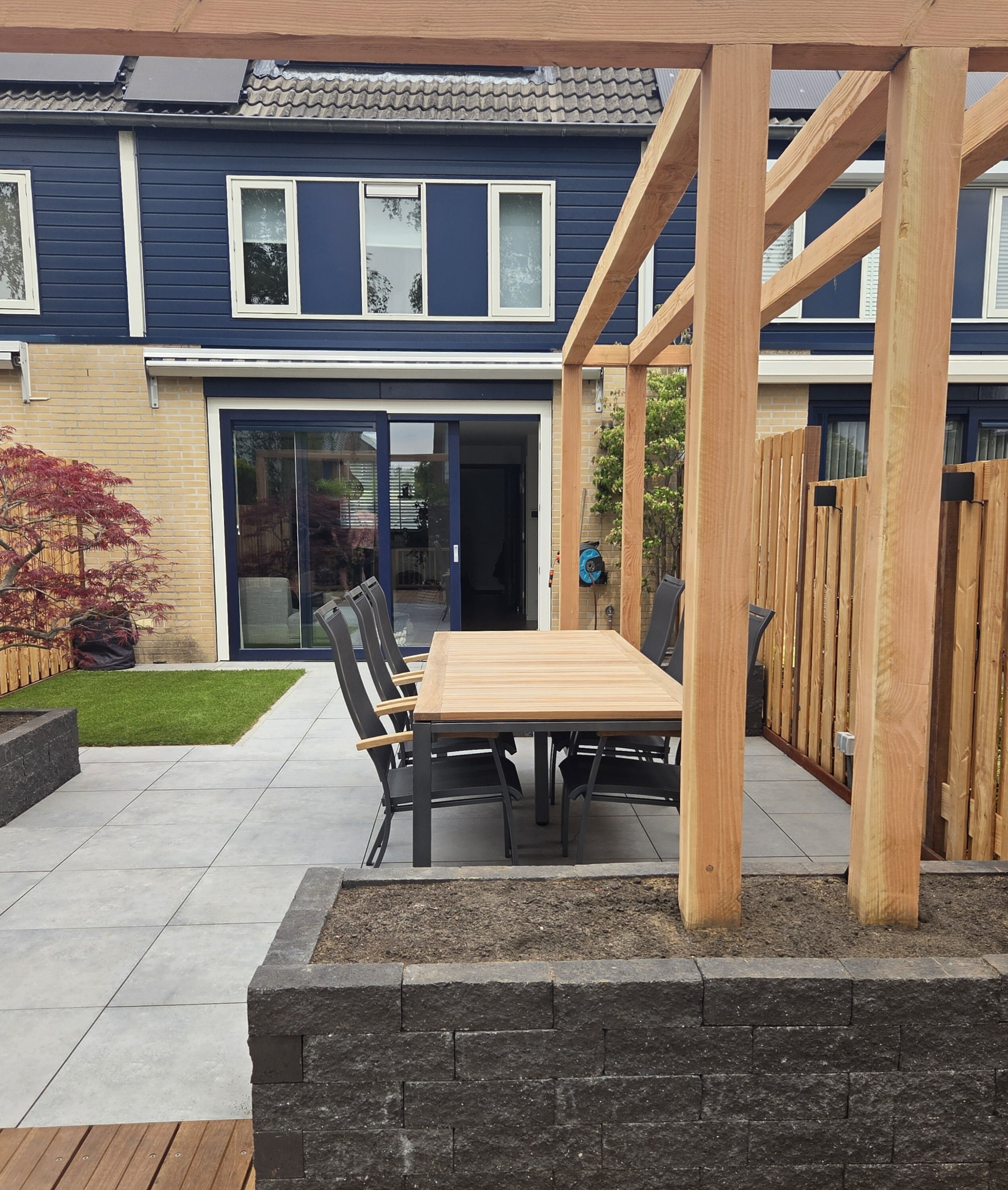 Een tuin aan het water in Mijdrecht die niet tot zijn recht kwam. De pergola, nieuwe vlonder en groene borders brengen nu leven, diepte en uitnodigende energie.