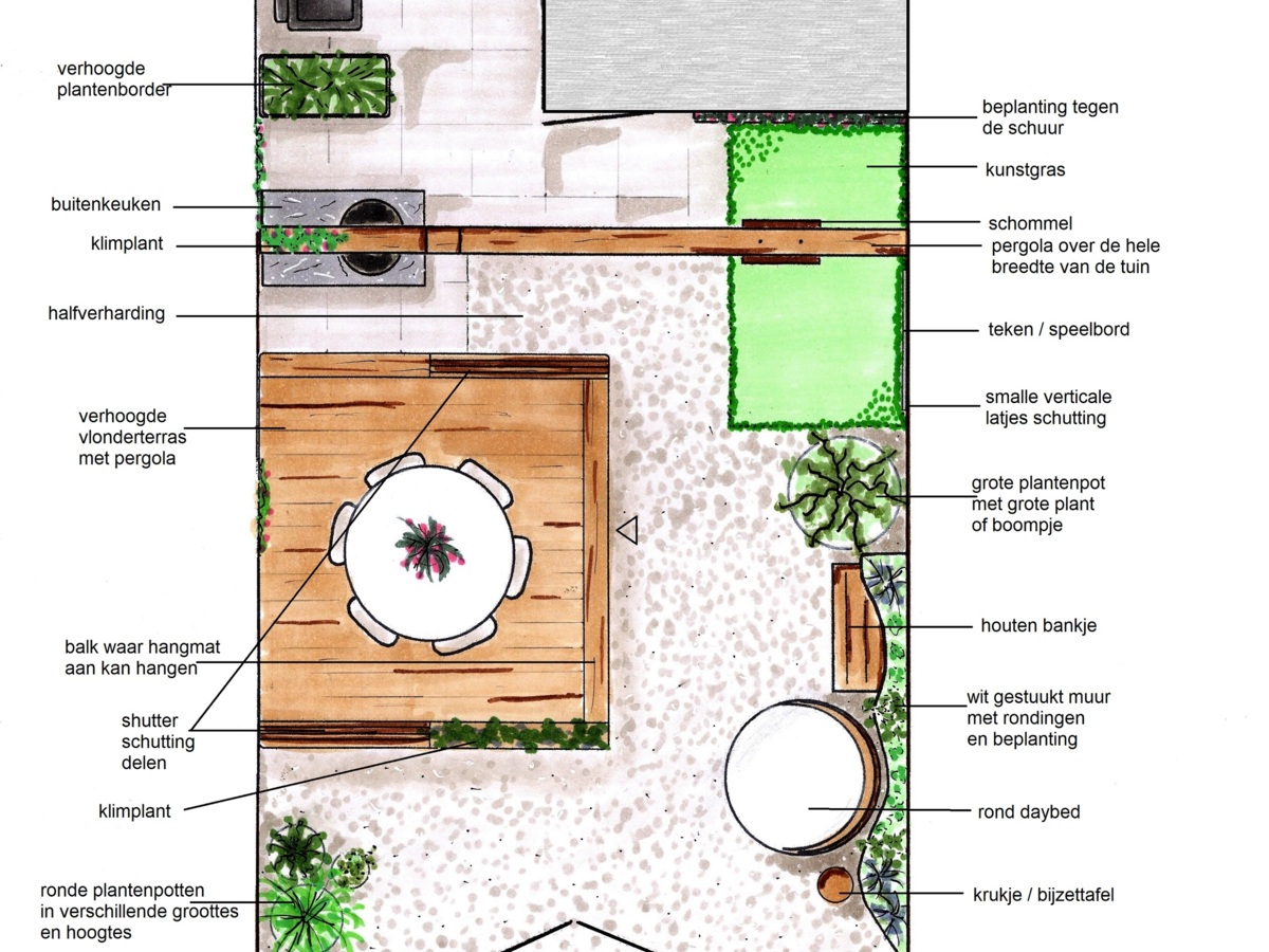 Van een grijs en grauwe achtertuin in Mijdrecht, naar een kindvriendelijke en frisse sfeer met een 'touch of Ibiza'.