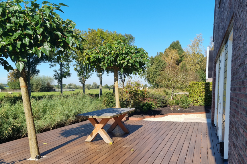 Een tuin aan het water in Mijdrecht die niet tot zijn recht kwam. De pergola, nieuwe vlonder en groene borders brengen nu leven, diepte en uitnodigende energie.