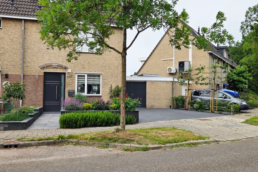 Zelfs een oprit kan karakter hebben. Deze voortuin in Mijdrecht kreeg één rustige basis van bestrating, gecombineerd met bloeiende verhoogde borders. De leibomen geven geborgenheid en een groene uitstraling.