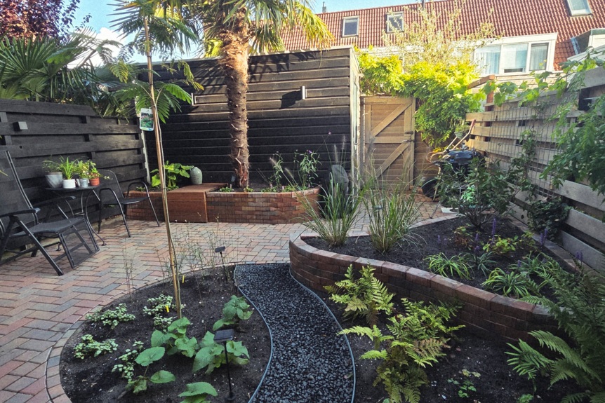 In Uithoorn kreeg een tuin met palmbomen en bestaande bestrating meer gelaagdheid en spanning. Verhoogde borders, verlichting en een pad door de beplanting maken het geheel levendig en eigen.
